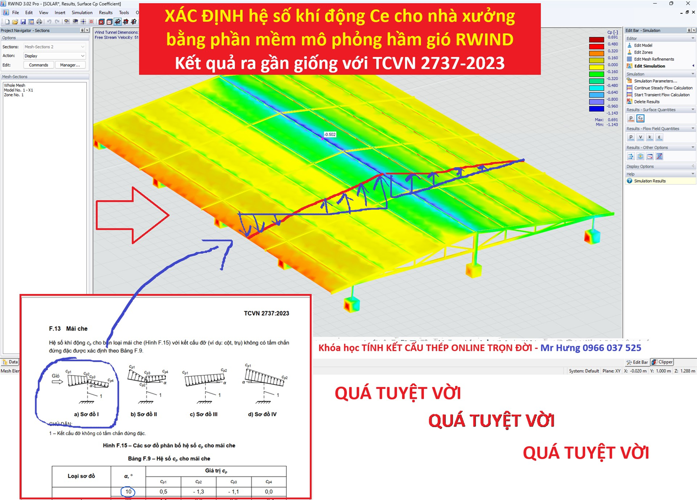 ➡️ kđ Một vấn đề cực kỳ quan trọng mà các kỹ sư làm kết cấu đều sợ và ngại là tính toán tải trọng gió cho các dạng nhà phức tạp, ví dụ như: Nhà xưởng có khoang cao, khoang thấp, nhà có tường hở một phần, nhà có mặt bằng méo mó.... Sở dĩ khó vì ngay cả tiêu chuẩn Việt Nam cũng không có đủ sơ đồ tính gió cho các dạng nhà phức tạp đó. Hiện tại chưa có 1 trung tâm nào dạy các dạng nhà phức tạp đó, nhưng khóa học này thì các học viên đều giải quyết các nhà phức tạp đó cực kỳ đơn giản vì em Hưng sẽ hướng dẫn các học viên sử dụng phần mềm MÔ PHỎNG HẦM GIÓ RWIND để có thể tính toán tải trọng gió lên tất cả các công trình có hình dạng khác nhau.