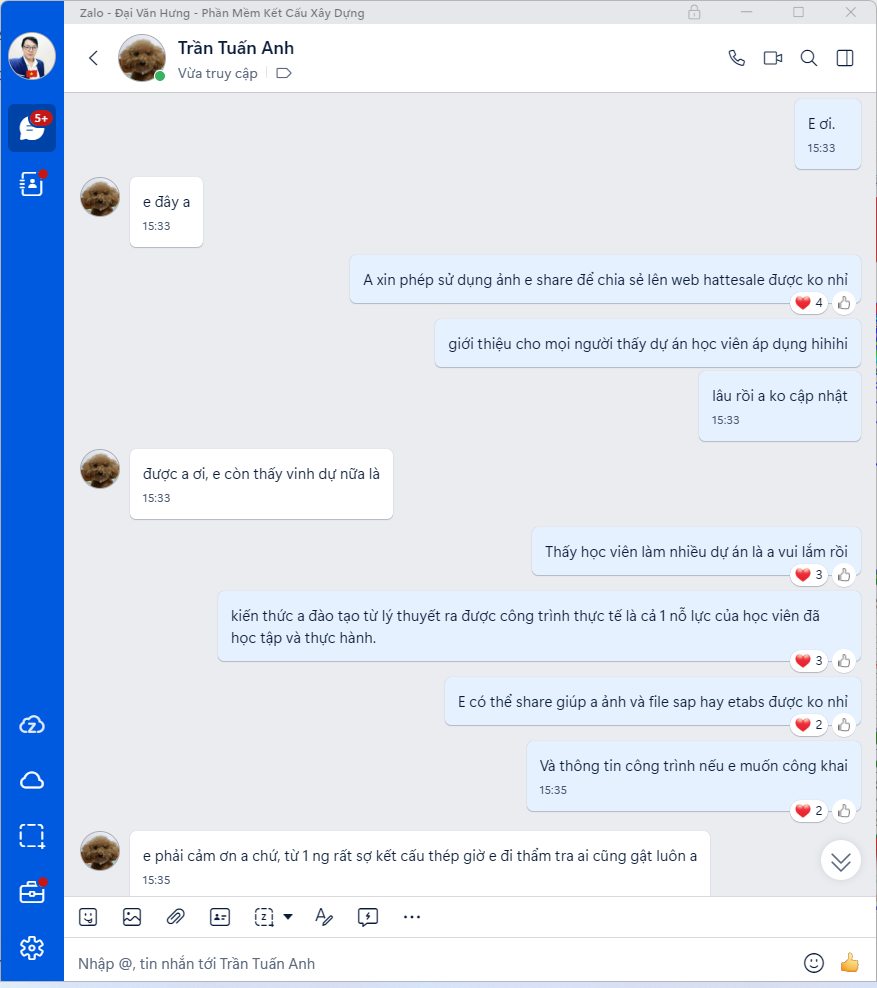 2. Kiến thức thì chỉ cần cứ xem đi xem lại video hướng dẫn của thầy là có thể hiểu được, nếu không hiểu lại dễ dàng hỏi thầy giáo ( Ảnh dưới chụp một vài tin nhắn chát học viên nhờ thầy hỗ trợ ), thỉnh thoảng vẫn được học zoom để giải đáp thắc mắc.