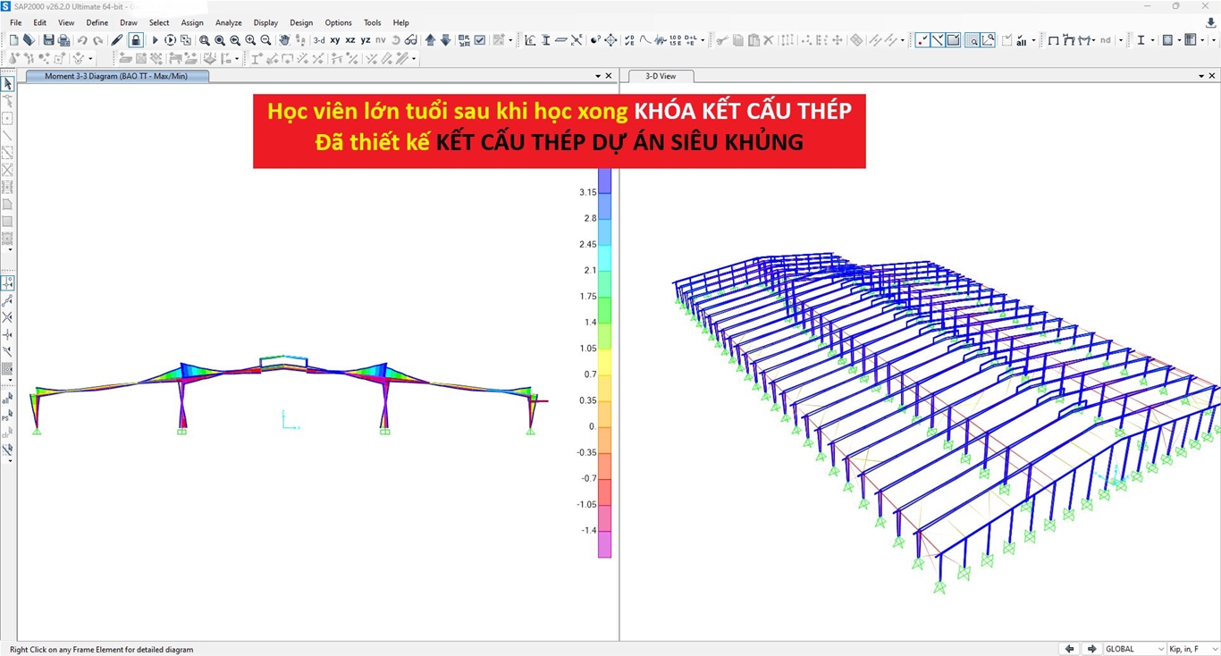 Mặc dù khóa học là tính kết cấu thép nhưng thực tế bạn cũng được học đầy đủ quy trình thiết kế kết cấu một công trình ( từ móng đến mái ). Khóa học còn dạy phần kết cấu nhà hội trường Đa Năng bê tông cốt thép có mái là kèo zamil, đây cũng có thể coi là kết cấu nhà bê tông, vì bạn được tính toán móng băng, tính các cấu kiện cột, dầm, sàn, võng, nứt, cầu thang, lanh tô...