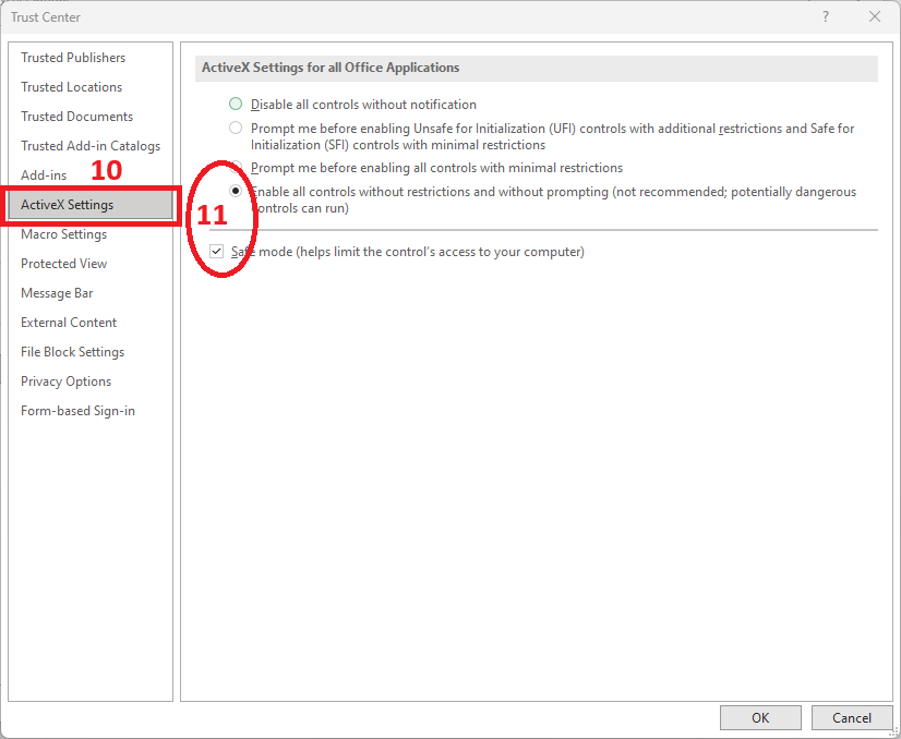 Mở Excel ->(1) chọn File -> (2) Chọn Options -> (3) Chọn Trust Center -> (4) Chọn Trust Center setting...